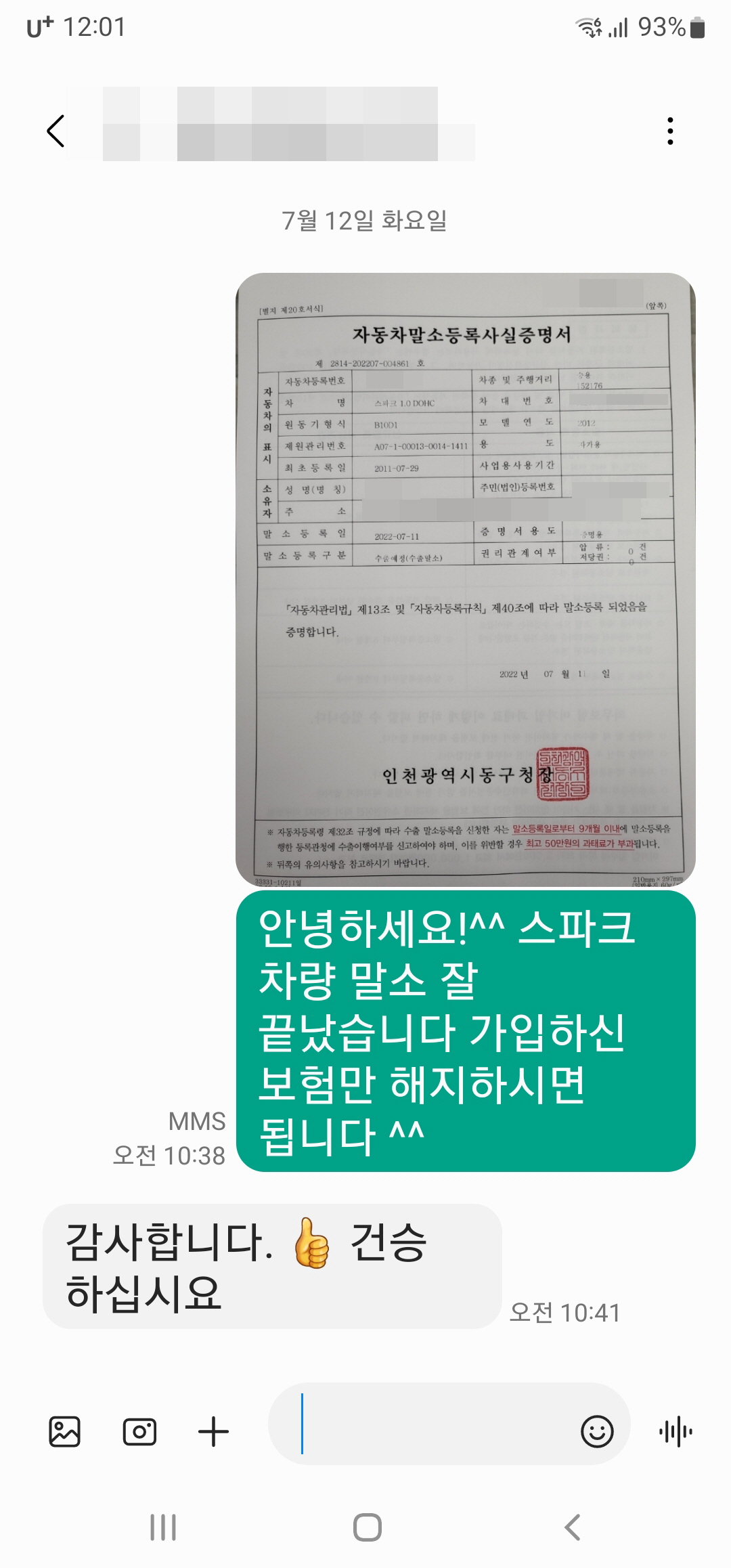 입고후 주말이 끝나고 스파크수출말소하여 차주님께 보내드리고 마무리를 하였습니다^^